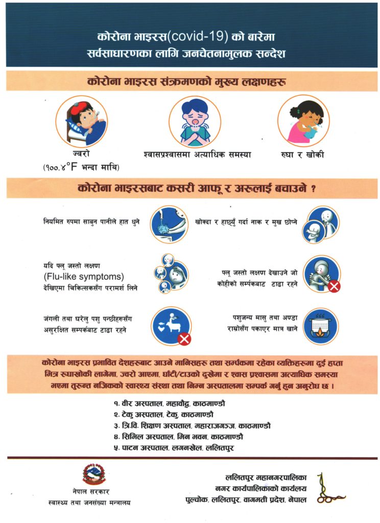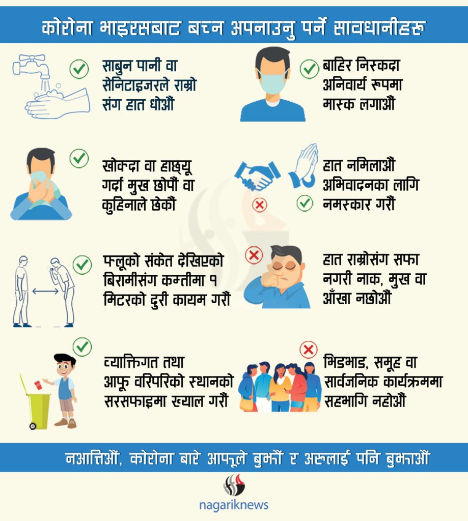तर यस कुरोको बेवास्ता गरेर हामीले आफ्नो घुडामा आफै बन्चरो हान्दैछौ । भोलि कोरोनाको महामारी नेपालमा पनि फैलियो भने त्यसको प्रभाव कसलाई पर्छ? एकपटक सोचौ त! तसर्थ लकडाउन अवधिभर अत्यावश्यक काम नपरी घरबाट बाहिर ननिस्कौ । पटकपटक साबुनपानीले हातमुख धोऔ । आफ्नो स्वास्थ्यको ख्याल आफै गरौ ।