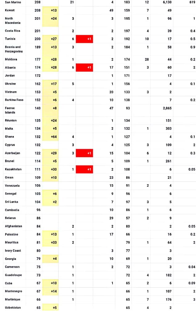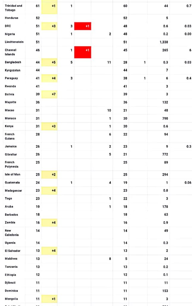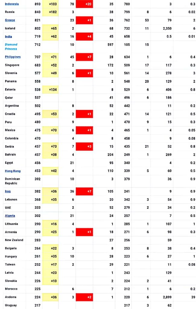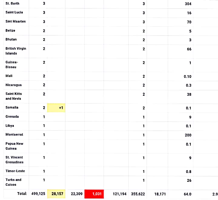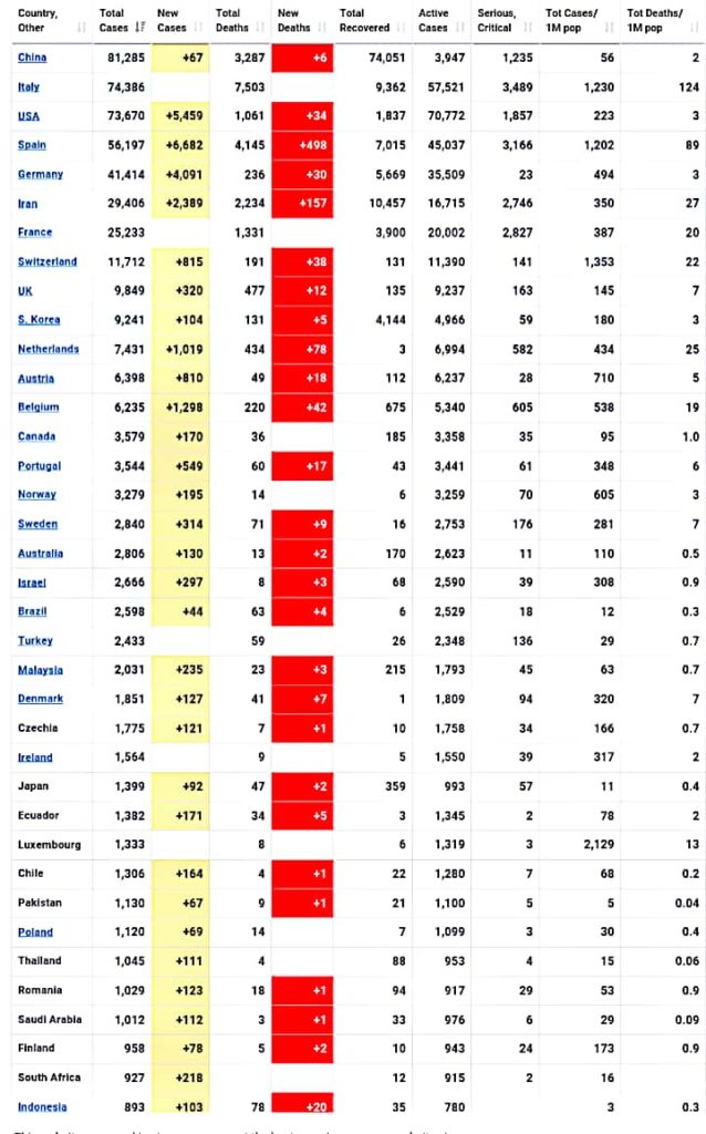आजसम्म आईपुग्दा विश्वमा लगभग ५ लाख (४९९,१२५ जना) कोरोनाका केसहरु देखिएको छ भने २२,३०९ जनाको मृत्यु भैसकेको तथ्यांक पाइएको छ । रोग लागेर निको भैसकेका मानिसहरुको संख्या भने १२१,१९४ जना रहेको छ । कोरोनाबाट मृत्यु हुनेमा सबैभन्दा धेरै ईटाली- ७,५०३ जना, स्पेन- ४,१४५ जना, चीन- ३,२८७ जना, ईरान- २,२३४ जना रहेको छ ।