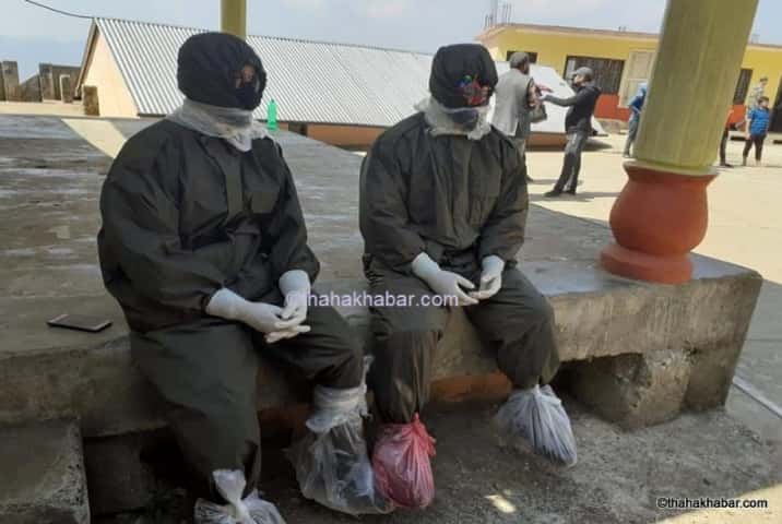 पाल्पा : पानी पर्दा लगाइने रेनकोट पहिरिएको शरीर, खुट्टा र घाँटीमा राता-सेता प्लास्टिकले छोपिएको अवस्था, आँखामा चस्मा, मुखमा कपडाको मास्क र हातमा ग्लोब्स लगाएका दुई मानिस। यो हो गोरखदल गण तानसेन पाल्पाका नेपाली सेनाका मेडिकल टिमका सदस्यको हुलिया।