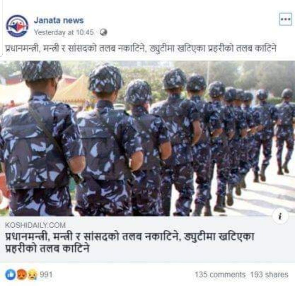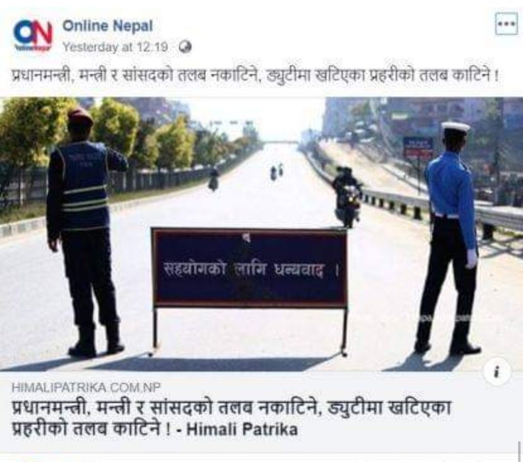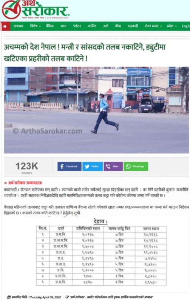 सामाजिक सञ्जालमा केही दिन यता एउटा समाचार निकै सेयर भएको छ। समाचारमा दावी गरिएको छ, ‘प्रम, मन्त्री र सांसदको तलब नकाटिने, ड्युटीमा रहेका प्रहरीको मात्र तलब काटिने।’ प्रतिष्ठित व्यक्तिहरुले समेत यस्तो हेडलाइन भएका समाचार आफ्नो विचार राखी वा नराखी सेयर गरेको देखिएको छ।
