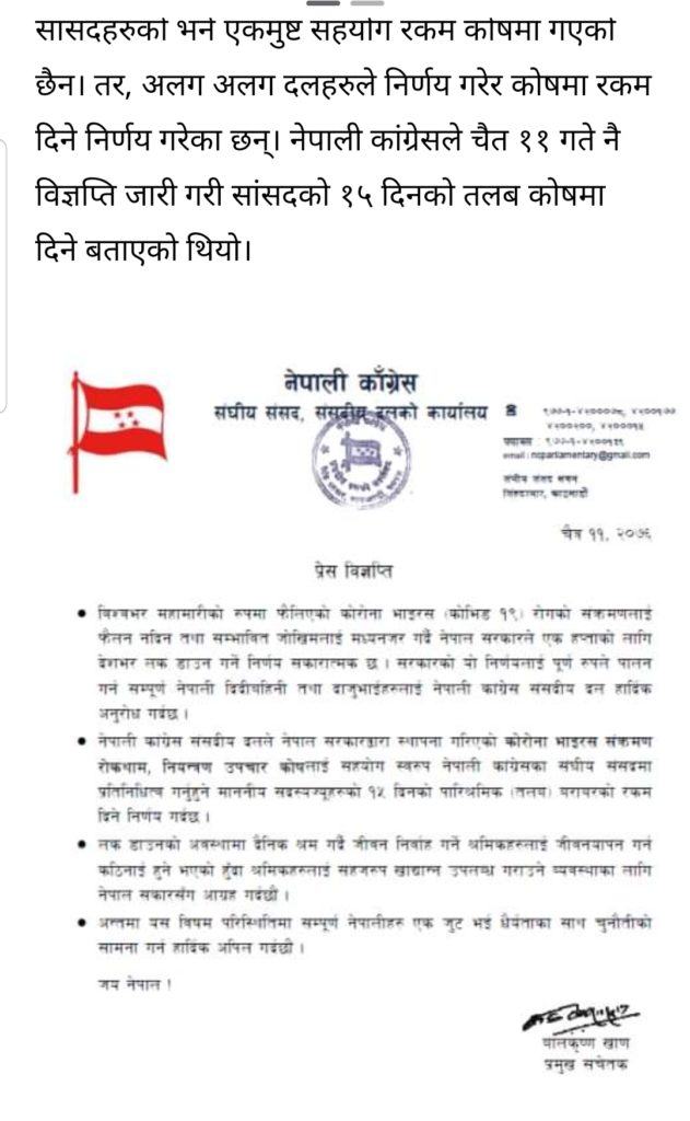 सांसदहरुको भने एकमुष्ट सहयोग रकम कोषमा गएको छैन। तर, अलग अलग दलहरुले निर्णय गरेर कोषमा रकम दिने निर्णय गरेका छन्। नेपाली कांग्रेसले चैत ११ गते नै विज्ञप्ति जारी गरी सांसदको १५ दिनको तलब कोषमा दिने बताएको थियो।