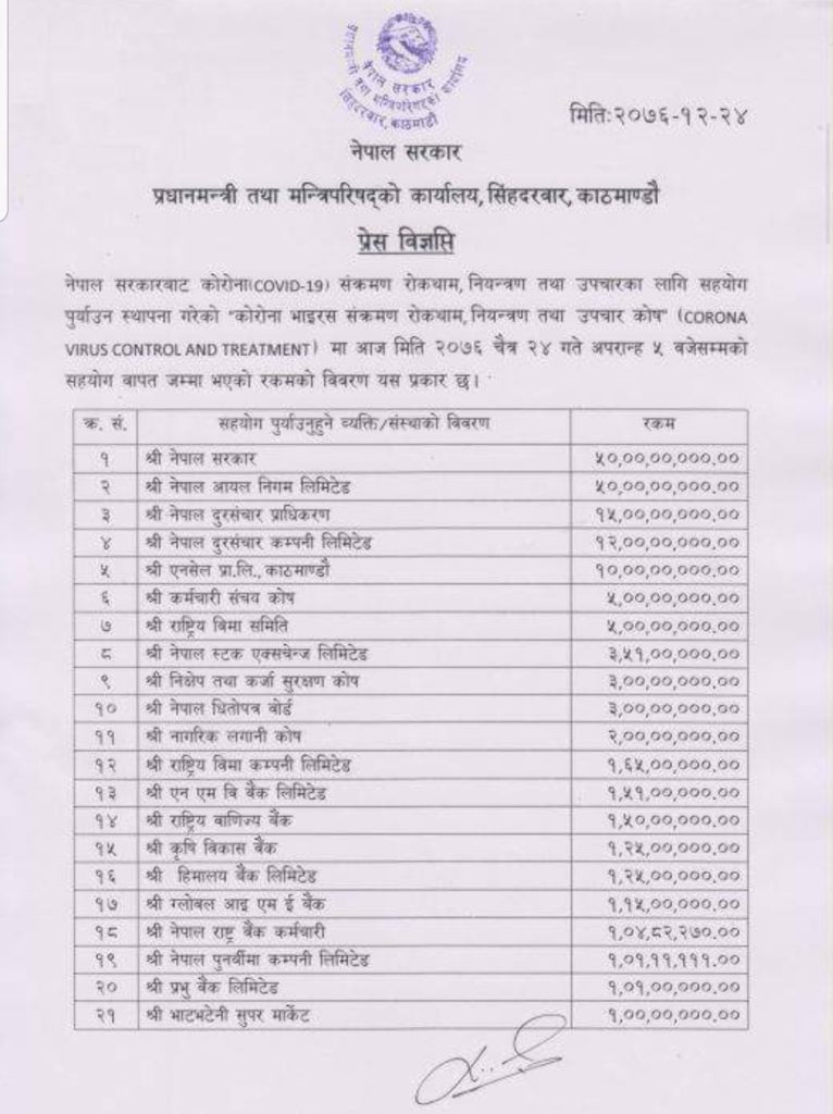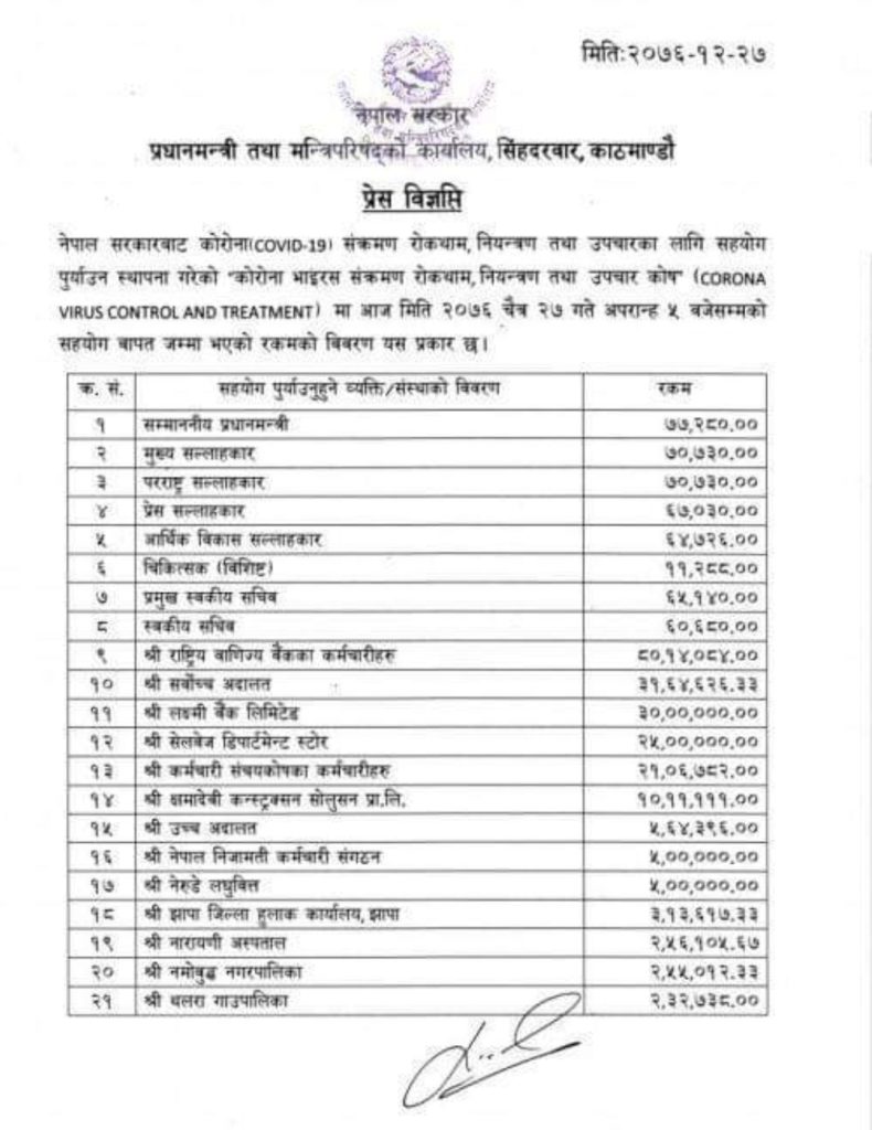 मन्त्रीहरुको अलग अलग नाम नभए पनि नेपाल सरकारको नामबाट एकमुष्ट ५० करोड रुपैयाँ कोषमा जम्मा भएको देखाइएको छ चैत २४ गते।