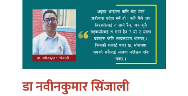 मनै त हो,अदृश्य भाइरस कति खेर मेरो शरीरमा प्रवेश गर्ने हो! कतै मैले अरु बिरामीलाई त सार्ने हैन, अरु कुनै सहकर्मीलाई त सार्ने हैन? यी र यस्ता प्रश्नहरू फेरि सल्बलाउन थाल्छन्। किनकी मलाई थाहा छ, संक्रमण भएको सबैलाई लक्षण नदेखिन पनि सक्छ।