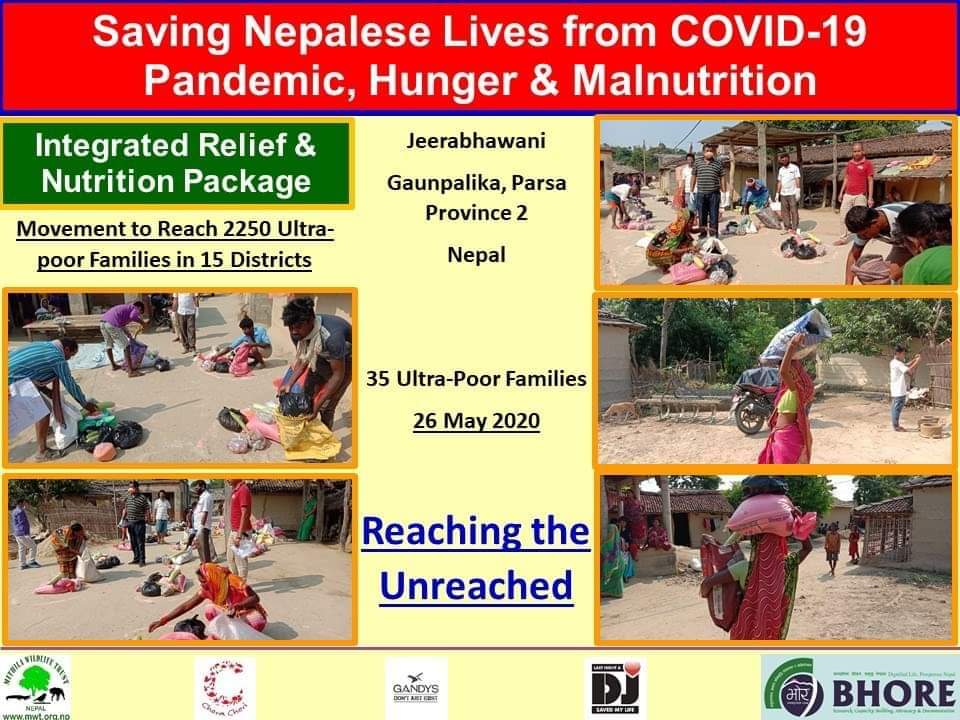 १३ जेठ, वीरगञ्ज । जीराभवानी गाउँपालिका–१ पकडीटोलाका ३५ धाँगड–मुसहर परिवारलाई राहत वितरण गरिएको छ। राज्यका तीनै अङ्गबाट राहत प्याकेज पाउनबाट वञ्चित पकडीटोलाका मानिसहरू लकडाउनमा अति कष्टकर जीवनयापन गर्दै आएको समाचार थाहा पाएर मिथिला वाइल्डलाइफ ट्रस्ट र भोर नामक संस्थाले उनीहरूको बस्तीमा राहत वितरण गरेको सामाजिक कार्यकर्ता प्रकाश थारूले बताए। छोरा छोरी, गानडिज र लास्ट नाइट अ डिजे सेभड माई लाइफ संस्थाहरुको आर्थिक सहयोगमा र मिथिला वाइल्डलाइफ ट्रस्ट तथा भोरको सहकार्यमा आफूले राहत वितरणको व्यवस्थापन मिलाएको सामाजिक कार्यकर्ता थारूले बताए। स्थानीय रामशरण खवास, अजगैवीनाथ गौरो, प्रभु चौधरीले थारूलाई यस काममा सघाएका थिए।