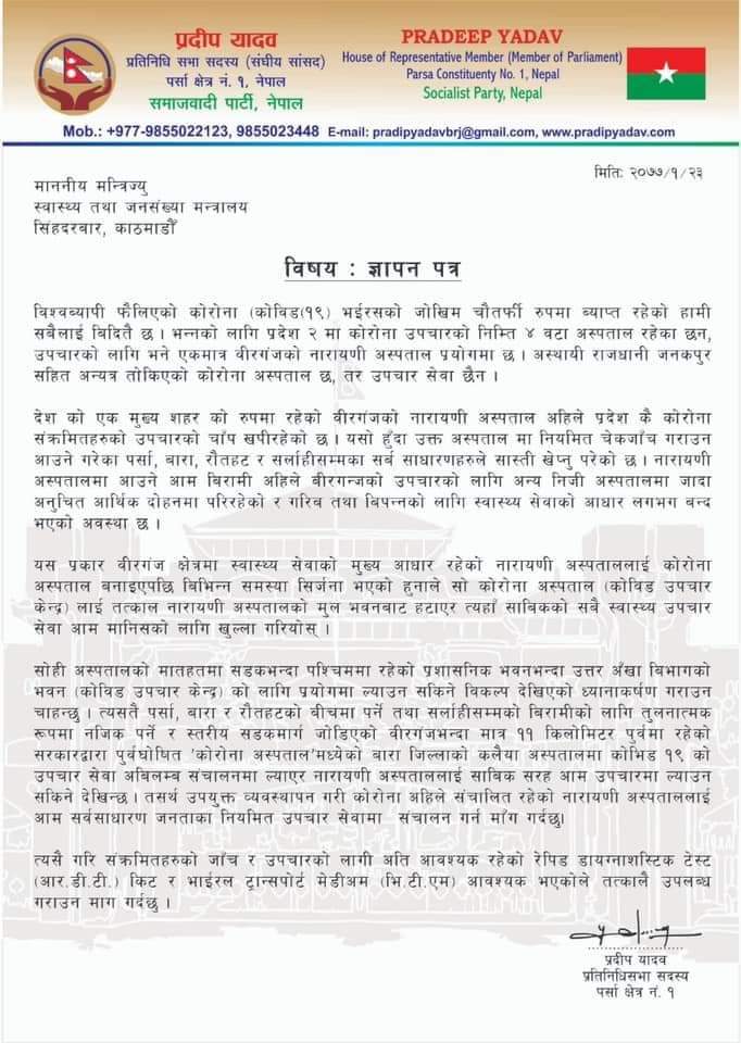 विश्वब्यापी फैलिएको कोरोना (कोविड १९) भईरसको जोखिम चौतर्फी रुपमा ब्याप्त रहेको बेला कोरोना अस्पतालमा रुपान्तरित नारायणी अस्पताललाई साबिक सरह आम उपचारमा ल्याउन साँसद यादवले स्वास्थ्य तथा जनसंख्या मन्त्री भानुभक्त ढकाललाई आज ज्ञापनपत्र बुझाएका छन् ।