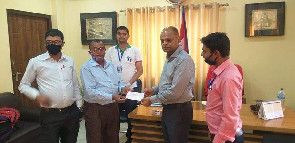 संघका अध्यक्ष राजेश पण्डितले महानगरपालिकाका नगरप्रमुख विजय कुमार सरावगीलाई चेक हस्तान्तरण गर्नुभएको छ ।