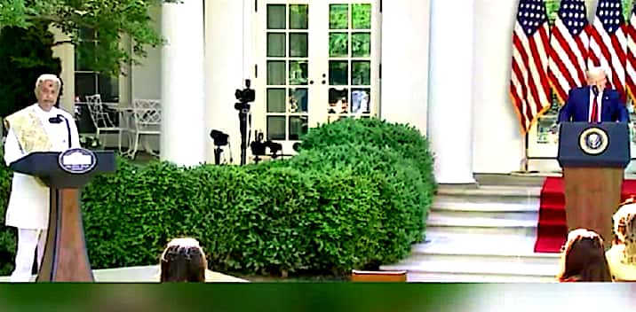 प्रथम महिला मेलानिया ट्रम्पले कोभिड–१९ महामारीमा आफ्ना प्रियजन गुमाएका परिवारप्रति सहानूभूति प्रकट गरिन् । न्यु जर्सीको रोब्बिन्सभिल्लीस्थित स्वाभिनारायण मन्दिरका पुजारीले ह्वाइटहाउसमा भएको प्रार्थनामा मन्त्रोच्चारण गरेको यो सायद पहिलोपटक हो । श्रोतः एनडी टिभी
