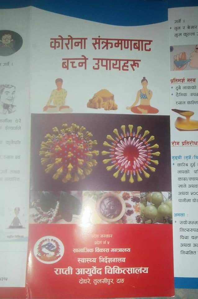 प्रदेश सरकार, सामाजिक विकास मन्त्रालय, बुटवलद्वारा कोरोना नियन्त्रण तथा रोकथाम सम्बन्धमा जारी निर्देशिका बमोजिम क्वारेन्टाइनमा बसेकालाई योगाभ्यास र जडिबुटीजन्य औषधि वितरण गरिएको राप्ती आयुर्वेद चिकित्सालयका प्रमुख डा. मदनकुमार बिसिले जानकारी दिनुभयो ।