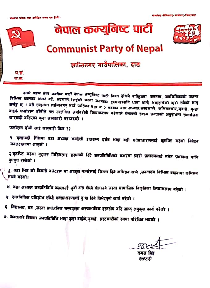 यता सरकारद्धारा प्रतिवन्धित विप्लव नेतृत्व नेकपाले वडाध्यक्ष डाँगी माथि जनकारवाही गरेको जनाएको छ । नेकपाका सेक्रेटरी कमल सिंहद्धारा जारी विज्ञप्तीमा वडाध्यक्ष डाँगी माथी जनकारवाही गरेको उल्लेख गरिएको छ । विज्ञप्तीमा वडाध्यक्ष डाँगीले वडा कार्यालयमा आफुखुसी आफना मान्छे राखेको, विकास निर्माणमा ढिलासुस्ती गरेको, नागरिक माथी दमन र कुटपिट गरेको लगाएतका आरोप लगाईएको छ ।