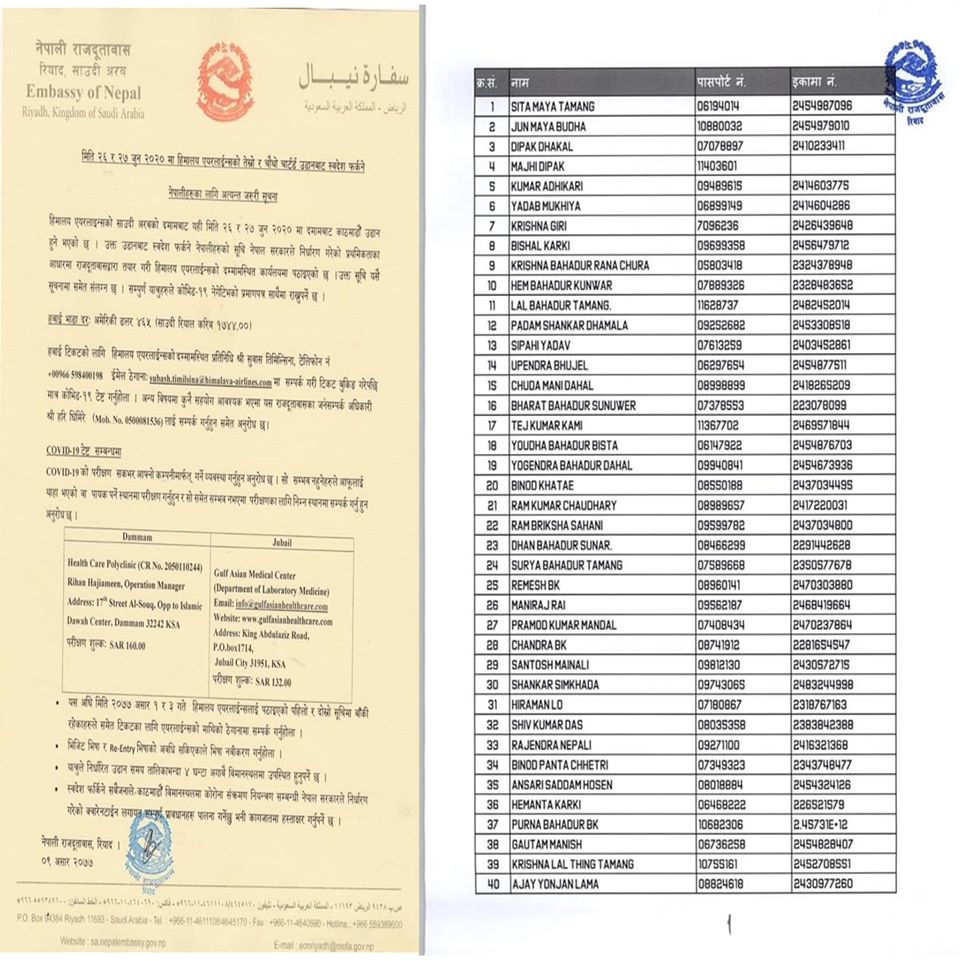 हिमालय एयरलाइन्सको साउदी अरबको दमामबाट यही मिति २६ र २७ जुन २०२० मा दमामबाट काठमाडौँ उडान हुने भएको छ । उक्त उडानबाट स्वदेश फर्कने नेपालीहरुको सूचि नेपाल सरकारले निर्धारण गरेको प्रथमिकताका आधारमा राजदूतावासद्वारा तयार गरी हिमालय एयरलाईन्सको दम्मामस्थित कार्यलयमा पठाइएको छ ।उक्त सूचि यसै सूचनामा समेत संलग्न छ । सम्पुर्ण यात्रुहरुले कोभिड-१९ नेगेटिभको प्रमाणपत्र साथैमा राख्नुपर्ने छ ।