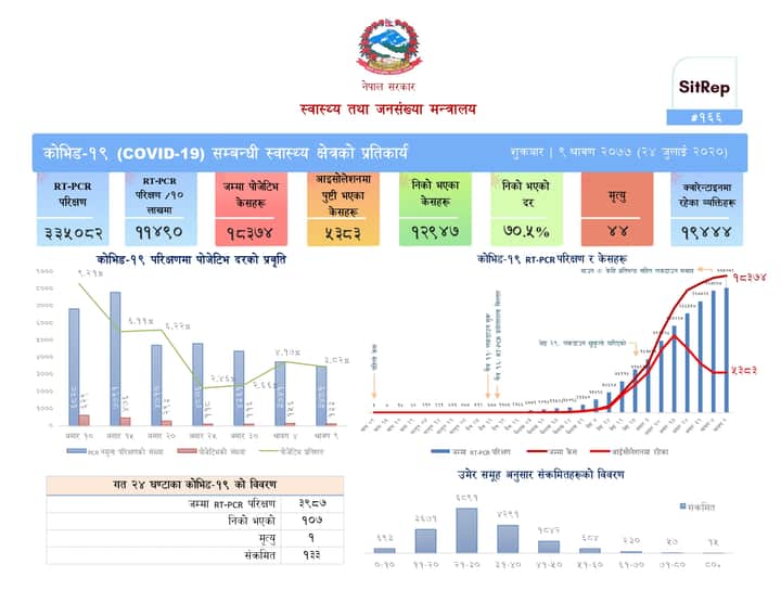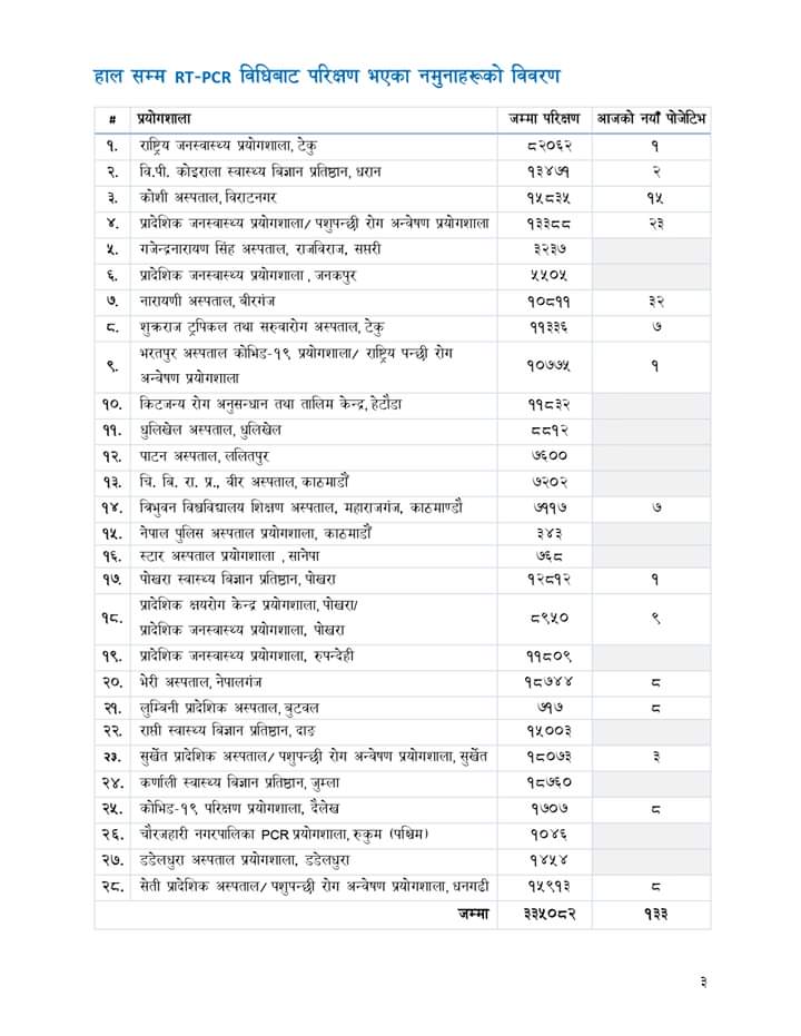 बिगत २४ घण्टामा नेपालका विभिन्न प्रयोगशालामा RT-PCR बिधिबाट ३ हजार ९ सय ८७ जनाको कोरोना परिक्षण गरिएको र हालसम्म ३ लाख ३५ हजार ०८२ जनाको उक्त प्रविधिबाट परिक्षण गरिएको स्वास्थ्य तथा जनसंख्या मन्त्रालयका प्रवक्ता डा जागेश्वर गौतमले जानकारी दिएका छन ।