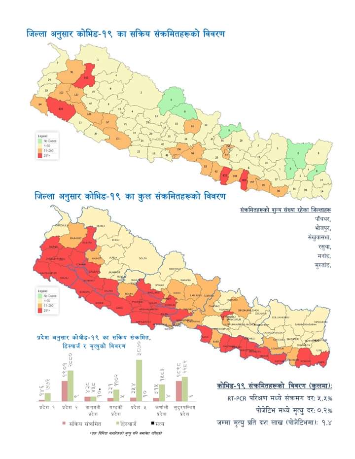 त्यस्तै कोरोनाका कारण हालसम्म मृत्यु हुनेको संख्या प्रदेश नं. २ मा ९ जना, बागमती प्रदेशमा १० जना, गण्डकी प्रदेशमा ५ जना, प्रदेश नं. ५ मा १० जना, कर्णाली प्रदेशमा ४ जना, र सुदुरपश्चिम प्रदेशमा ६ जना रहेकोे छ ।