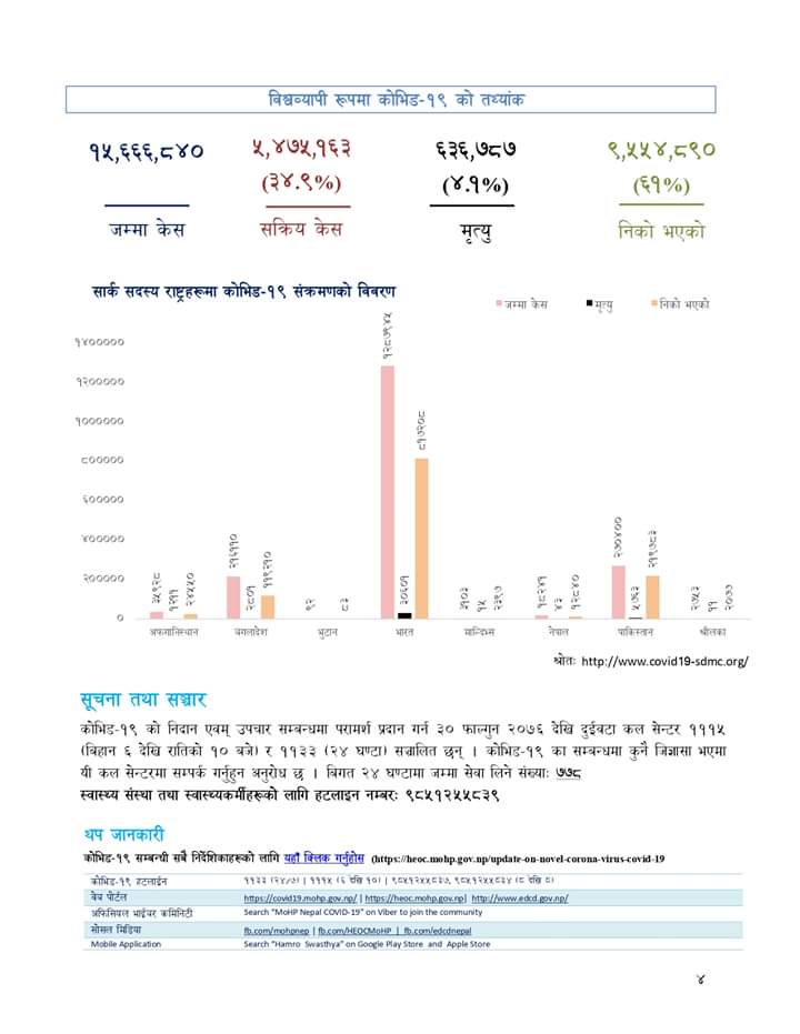 विश्वभर हालसम्म कोरोनाको जम्मा केस संख्या १,५६,६६,८४० रहेको छ भने सक्रिय संक्रमित संख्या ५४,७५,१६३ रहेको छ । हालसम्म मृत्यु हुने विरामीको संख्या ६,३६,७८७ पुगेको छ । निको भई घर फर्कनेको संख्या ९५,५४,८९० जना रहेको छ ।
