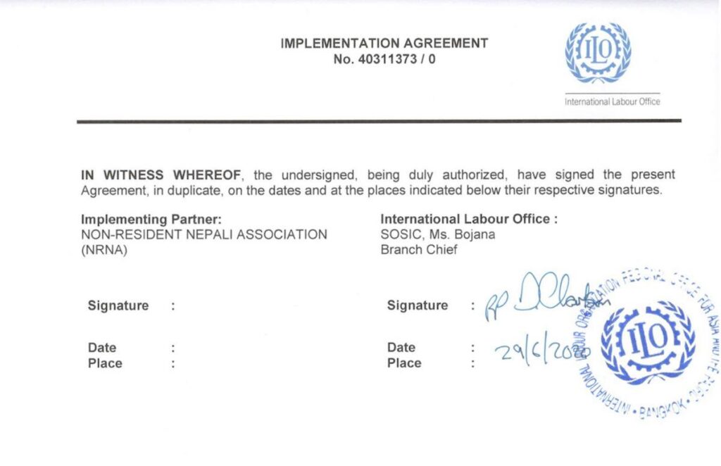 एनआरएनए र ILO जुन २९, २०२० मा ४,२४,३१० अमेरिकी डलर जसको नेपाली जुलाई ४, २०२० को नेपाल राष्ट्र बैंकको दर अनुसार ५,०१,४९, १९८ रहयोग रकमको संझौता भएको छ। अन्तर्राष्ट्रिय श्रम संगठनले बैदेशिक रोजगारीमा गएर समस्यामा परेका श्रमिकहरुको सहयोगको लागि एनआरएनएले गरेको सहयोग प्रस्तावको लागि सो रकम प्रदान गरेको हो।