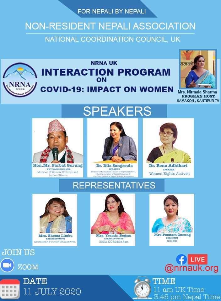 गैरआवासीय नेपाली संघ (एनआरएनए यूकेले) ‘कोभिड १९’ ले महिलामा पारेको प्रभावबारे एक परिणाममुखी अन्तरक्रिया कार्यक्रम सम्पन्न गरेको छ । शनिबार जुमबाट गरिएको उक्त अन्तरक्रियामा महिला बालवालिका तथा समाज कल्याण मन्त्री पार्वत गुरुङ प्रमुख अतिथि थिए ।