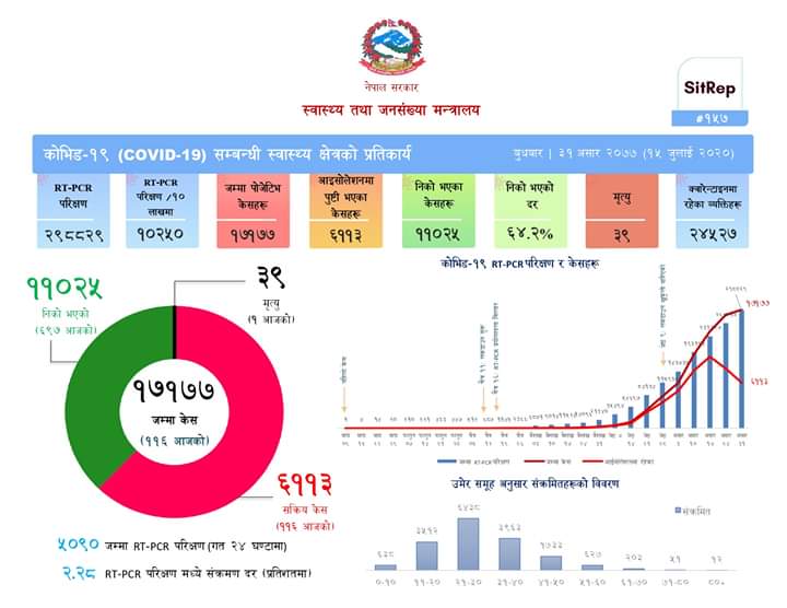 नेपालमा विगत २४ घण्टामा ११६ जना नयाँ संक्रमित थपिएका छन। आज थपिएका संक्रमित सँगै नेपालमा कोरोना संक्रमितको संख्या १७ हजार १ सय ७७ पुगेको छ । स्वास्थ्य तथा जनसंख्या मन्त्रालयको नियमित प्रेस ब्रीफिङ कार्यक्रममा प्रबक्ता जागेश्वर गौतमले उक्त जानकारी दिएका हुन ।