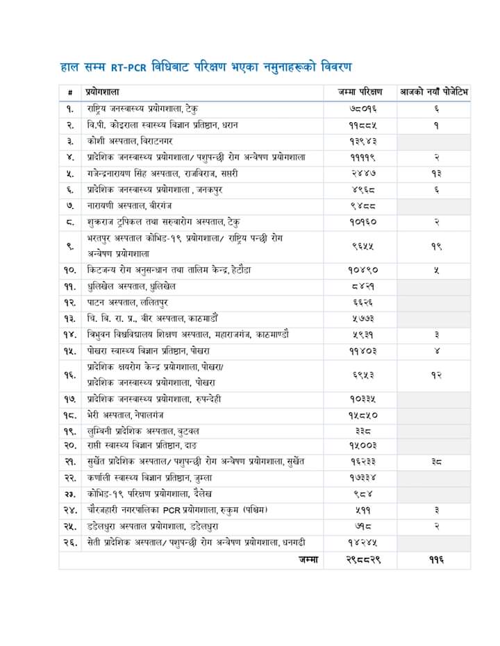 बिगत २४ घण्टामा नेपालका प्रयोगशालामा RT-PCR बिधिबाट ५ हजार ९० जनाको कोरोना परिक्षण गरिएको र हालसम्म २ लाख ९८ हजार ८ सय २९ जनाको उक्त प्रविधिबाट परिक्षण गरिएको स्वास्थ्य तथा जनसंख्या मन्त्रालयका प्रवक्ता डा जागेश्वर गौतमले जानकारी दिएका छन ।
