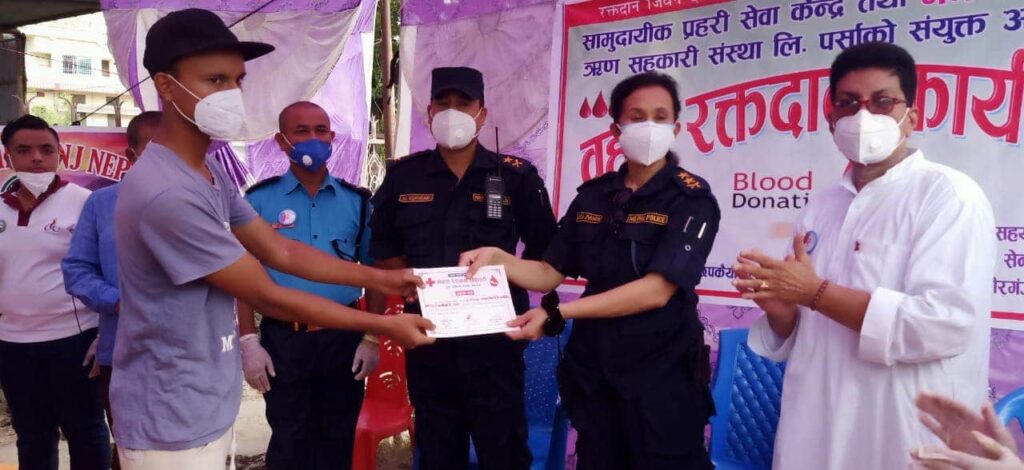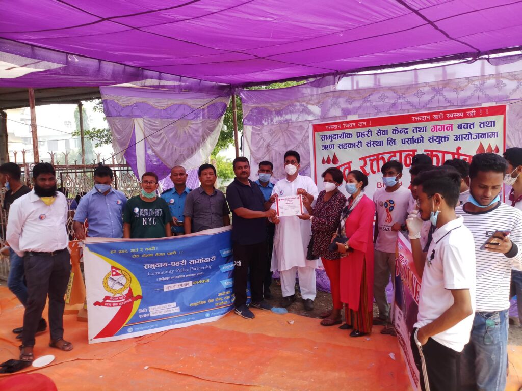 सामुदायिक सेवा केन्द्र तथा सामुदायिक प्रहरी सेवा छपकैया-२ र गगन बचत तथा ऋण सहकारी सस्था लि. पर्साको सन्युक्त आयोजनामा बृहत रक्तदान कार्यक्रम सम्पन्न भयो।