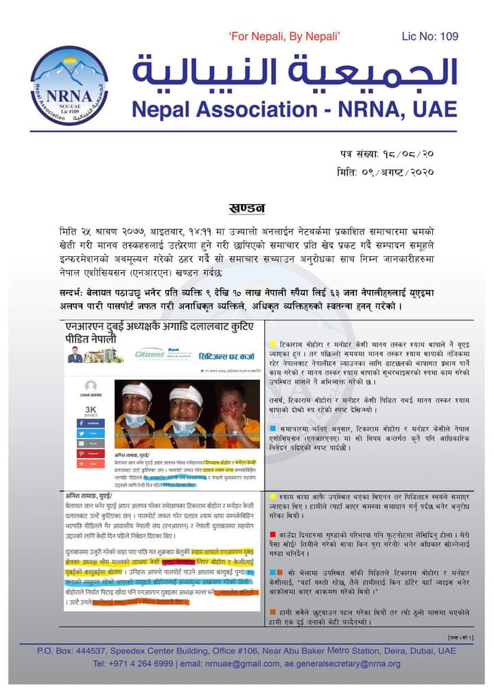 मिति २५ श्रावण २०७७, आइतवार का दिन उज्यालोनेटवर्कले प्रकाशित गरेको समाचार “युएईका एनआरएनए अध्यक्षकै अगाडि दलाल बाट कुटिए” भन्ने समाचार प्रति एनआरएनए युएईद्वारा एक बिग्यप्ती निकाल्दै खण्डन गरेको छ ।
