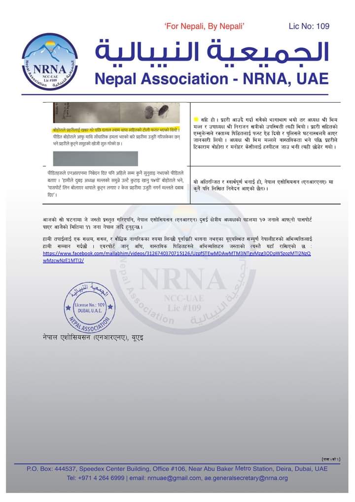 बेलायत जानका लागी युएई आएपछि पासपोर्ट जफत गरेर दलाल श्याम थापा सम्पर्कबिहिन भएको र पीडितले गैर आवासीय नेपाली संघ (एनआरएन) तथा नेपाली दुताबासमा सहयोग उद्दारको लागि निबेदन दिएको, उक्त कुराको जानकारी पाएलगत्तै शुक्रबार बेलुकी श्याम थापाले एनआरएनका अध्यक्ष भीम मल्लको साथमा केही गुण्डा केटाहरु लिएर बोहोरा र केसीलाई दुबईको बरदुबईमा बोलाएर १० जनाको समुहमा रहेको थापाको समुहले बोहोरालाई अन्धाधुन्ध आक्रमण गरेको, बोहोराले निर्घात पिटाइ खाँदा पनि एनआरएन दुबइका अध्यक्ष मल्ल भने दर्शक बनिरहेको र उल्टै प्रहरीलाई खबर नगर्न र मिल्न चेतावनी दिएको भन्ने समाचार उज्यालोनेट्वोर्क.कम ले छापिय पछि खबर मा सत्यता न भएको भनि (एनआरएन) यु.ए.इ ले एक बिग्यप्तिका साथ खण्डन गरेको छ ।