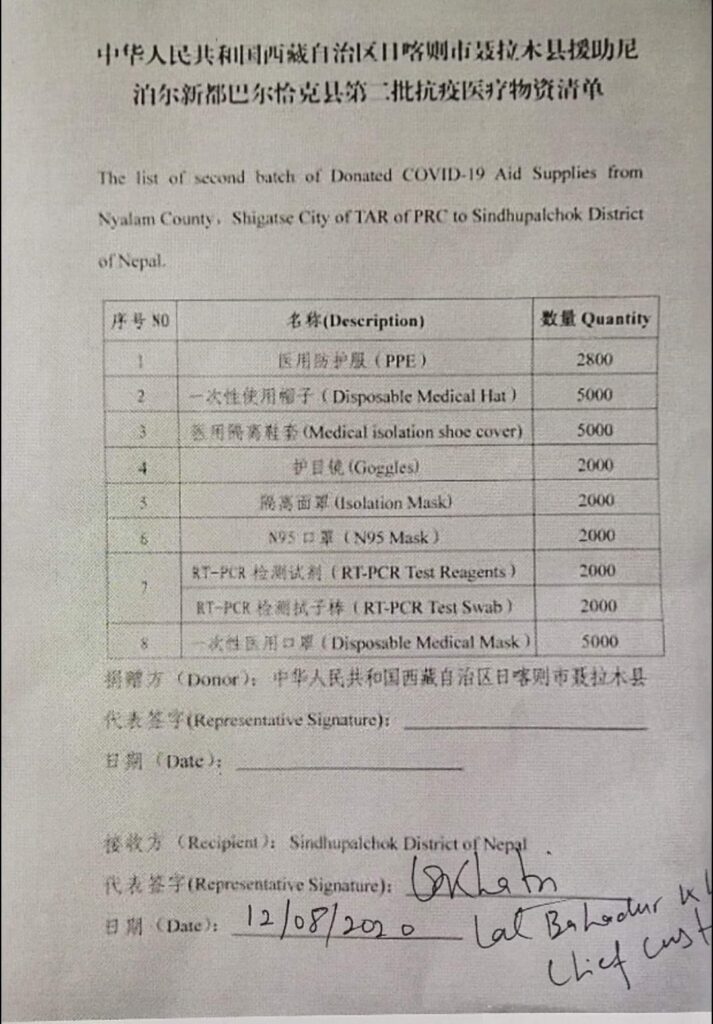 सिन्धुपाल्चोक । कोरोना महामारीका समयमा चीनको तिब्बत, नेलम काउन्टीले सिन्धुपाल्चोक जिल्लालाई अहिलेसम्मकै ठूलो मात्राको स्वास्थ्य सामग्री प्रदान गरेको छ । स्थानीय मितेरी पुलमा आज सो सहयोग सामग्री हस्तान्तरण गरिएको हो ।