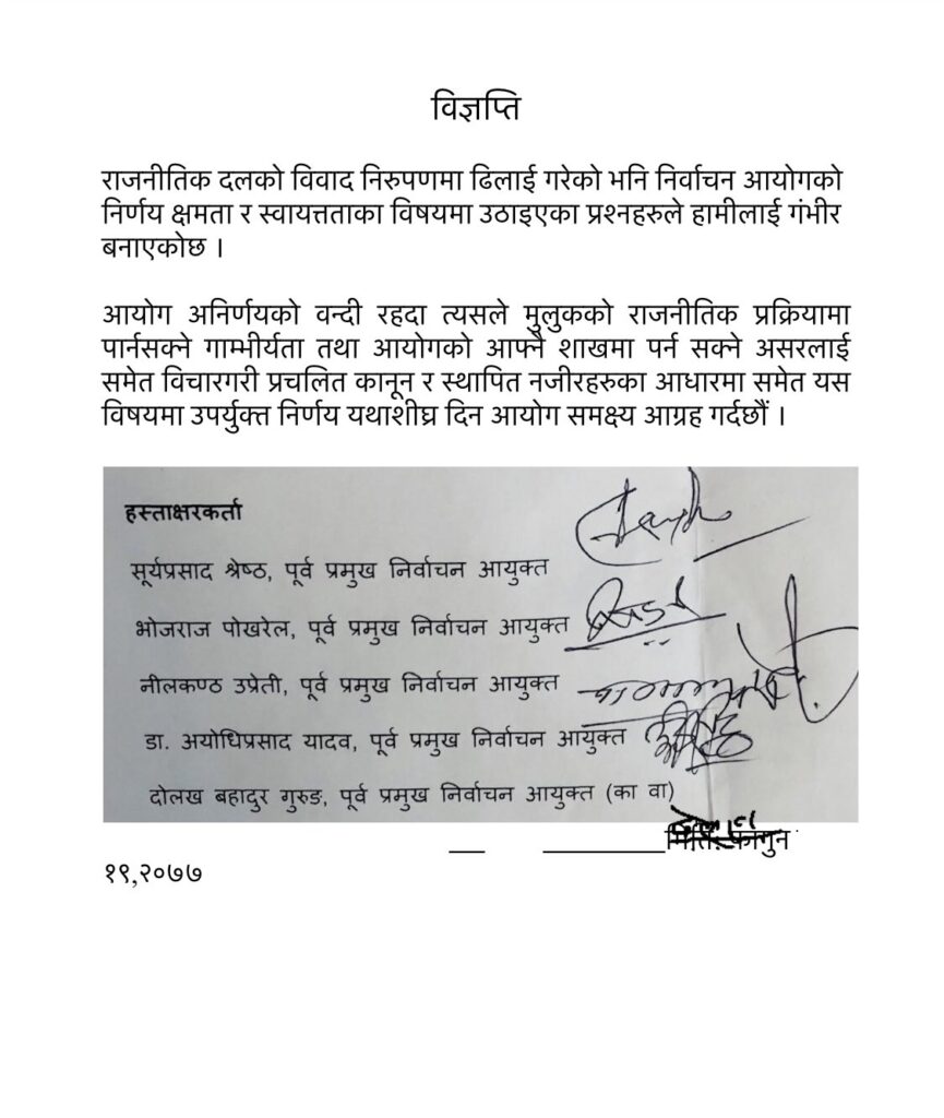 पूर्व प्रमुख निर्वाचन आयुक्तहरू सूर्यप्रसाद श्रेष्ठ, भोजराज पोखरेल, नीलकण्ठ उप्रेती, अयोधिप्रसाद यादव, दोलख बहादुर गुरूङले संयुक्त विज्ञप्ति जारी गरेका हुन्।नेकपा ओली समूह र प्रचण्ड-नेपाल समूहले आफूहरू नै आधिकारिक पार्टी भएको दाबी गर्दै आएका छन्।