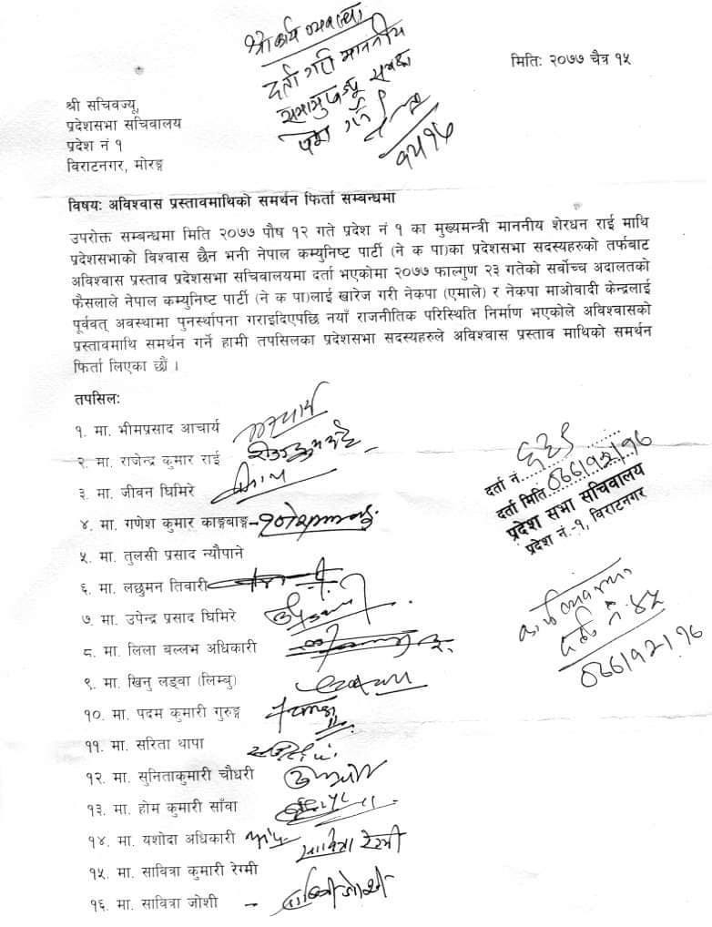 प्रदेश सभामा सामूहिक पत्र पठाउँदै एमालेका १६ जना सांसदले अविश्वास प्रस्तावमा गरेको समर्थन फिर्ता लिएको जानकारी दिएका हुन्।