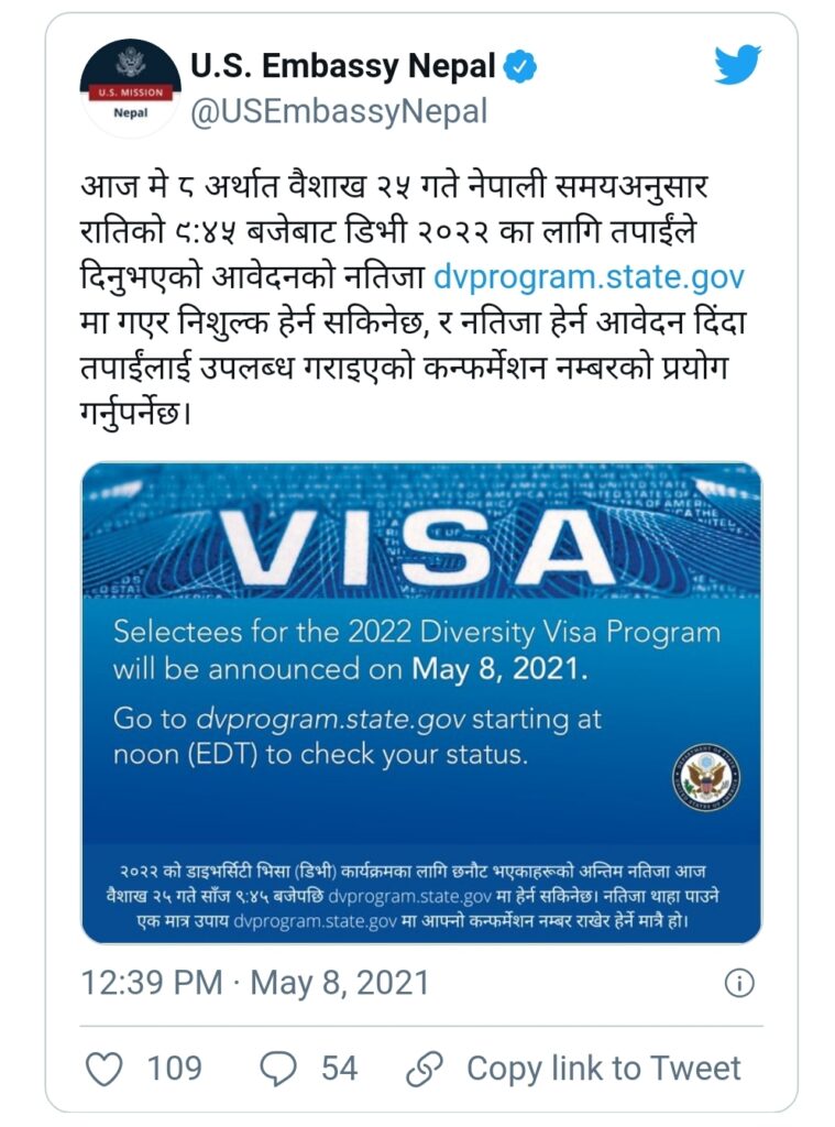 • सन् २०२२ का लागि भरिएको डीभीको नतिजा सार्वजनिक भएको छ । नेपालस्थित अमेरिकी दूतावासका अनुसार वैशाख २५ गते राति ९ः४५ बजेबाट आवेदनको नतिजा निःशुल्क हेर्न सकिनेछ । नतिजा हेर्न आवेदन दिँदा उपलब्ध गराइएको कन्फर्मेशन नम्बर प्रयोग गर्नुपर्नेछ ।
