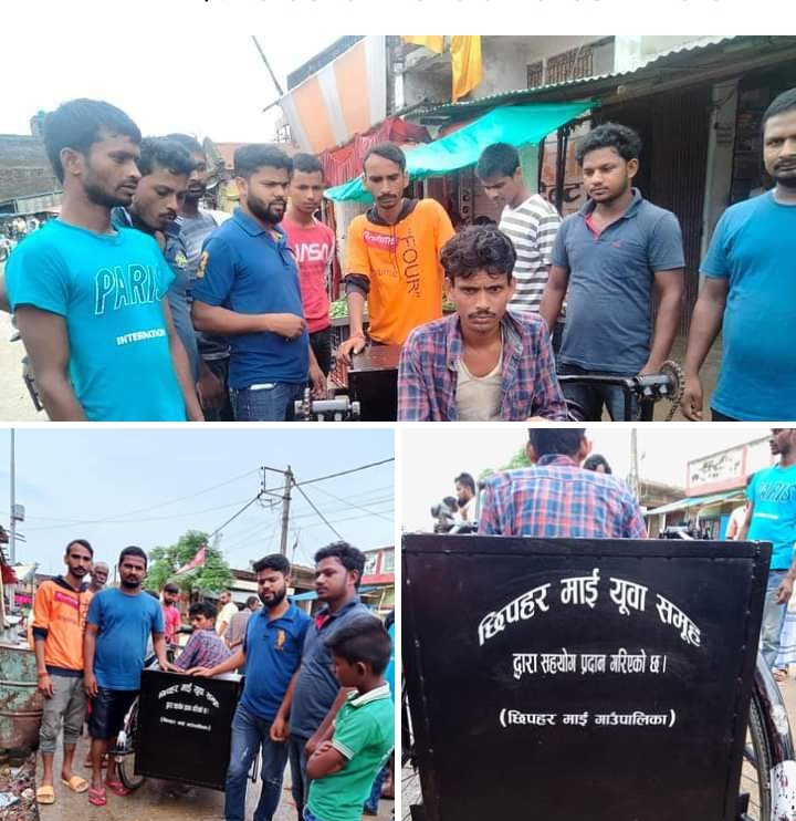छिपहरमाई युवा समुहका युवाहरु ले एक स्थानीय अपांग लाई तीन पान्ग्रे साइकल सहयोग गरेका छन । छिपहरमाई गाउँ पालिका वडा नम्बर ४ बंजारीका स्थानीय वासिन्दा गुड्डू महतो कमकर लाई आज छिपहरमाई युवा समूह ले तिन पान्ग्रे साइकल उपलब्ध गराई सहयोग गरेको छ ।