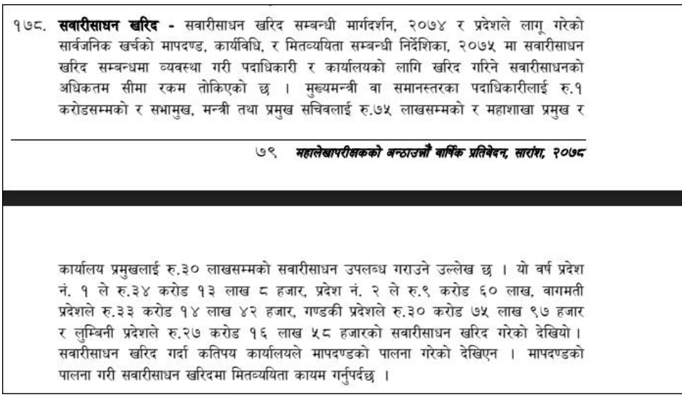 गण्डकी प्रदेशले ३० करोड ७५ लाख ९७ हजार, लुम्बिनी प्रदेशेले ३७ करोड १६ लाख ५८ हजार सवारी खरिदमा खर्च गर्दा प्रदेश २ ले प्रदेश २ ले ९ करोड ६० लाख खर्च गरेको ५८ औं प्रतिवेदनमा उल्लेख छ ।