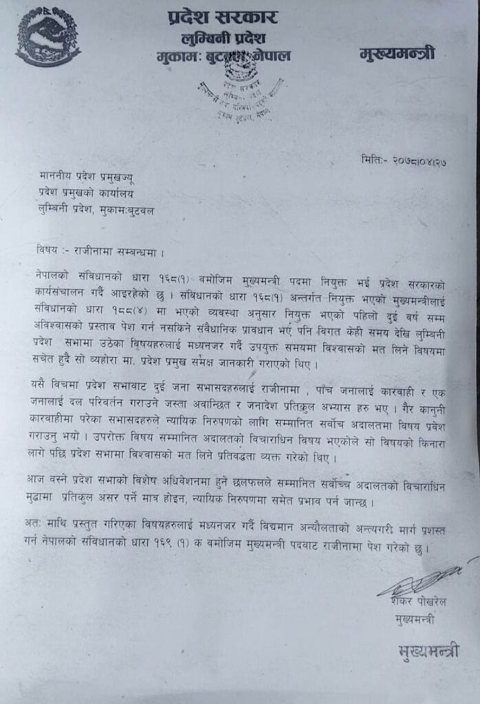 हेर्नुहोस् मुख्यमन्त्री पोखरेलको राजीनामा पत्र
