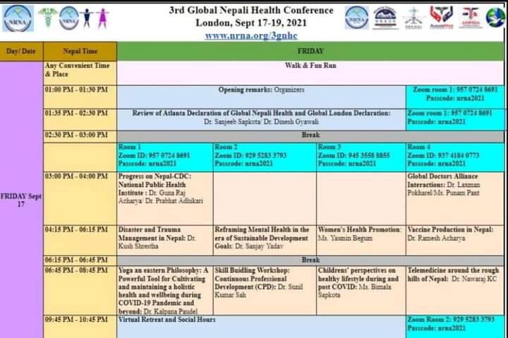 १३ सेप्टेम्बर २०२१, गैर आवासीय नेपाली संघ स्वास्थ कमिटीद्वारा आयोजित तेस्रो ग्लोबल नेपाली स्वास्थ्य सम्मेलन यहि आऊदो सेप्टेम्बर १७ देखि १९, २०२१मा लन्डनमा हुन गईरहेको छ ।