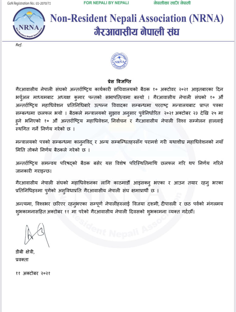 गैरआवासीय नेपाली संघको १० औँ अन्तर्राष्ट्रिय महाधिवेशन प्रतिनिधिबारे उत्पन्न विवादका सम्बन्धमा परराष्ट्र मन्त्रालयबाट प्राप्त पत्र उपर छलफल गरी मन्त्रालयको सुझाव अनुसार पुर्वनिर्धारित २३ देखि २५ अक्टोबर २०२१ मा हुने भनिएको १० औँ अन्तर्राष्ट्रिय महाधिवेशन, निर्वाचन र गैरआवासीय नेपाली विश्व सम्मेलन हाललाई स्थगित गर्ने निर्णय गरेको विज्ञप्तिमा उल्लेख गरिएको छ ।