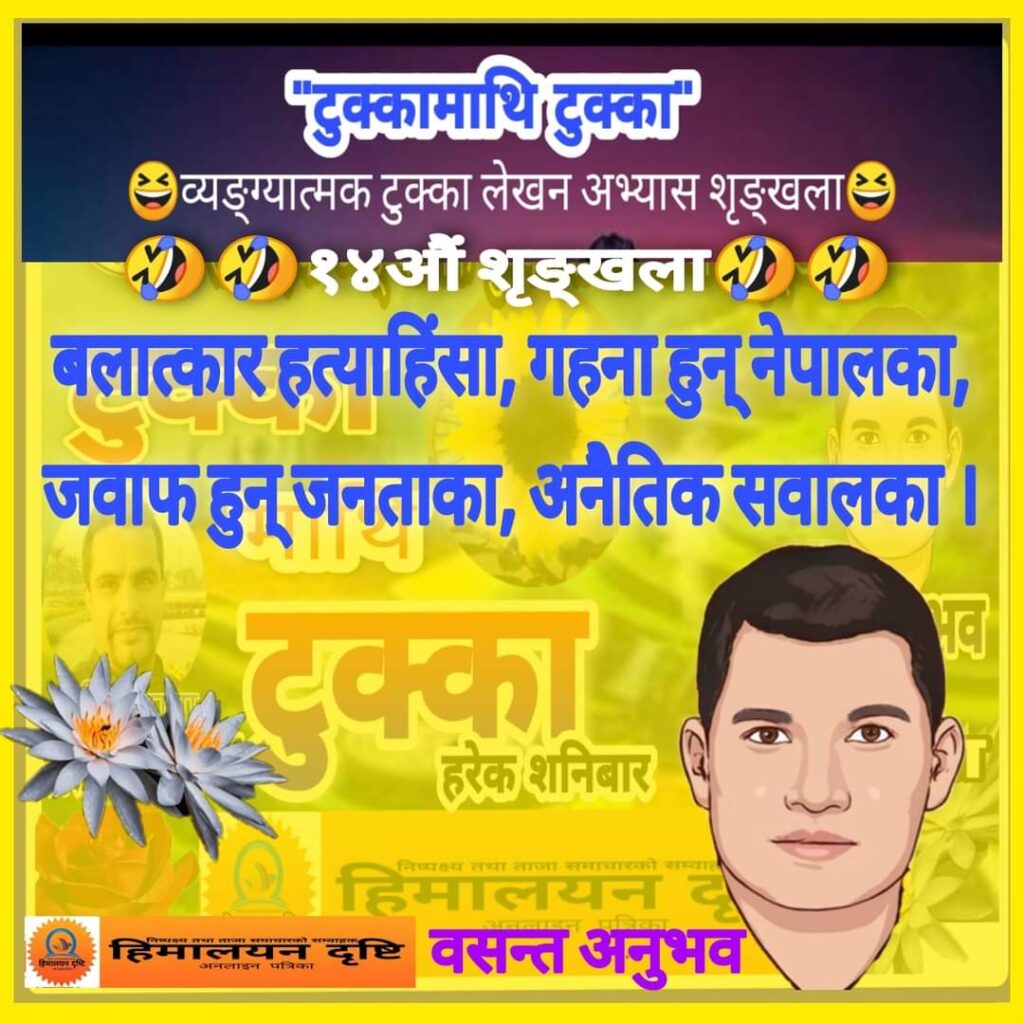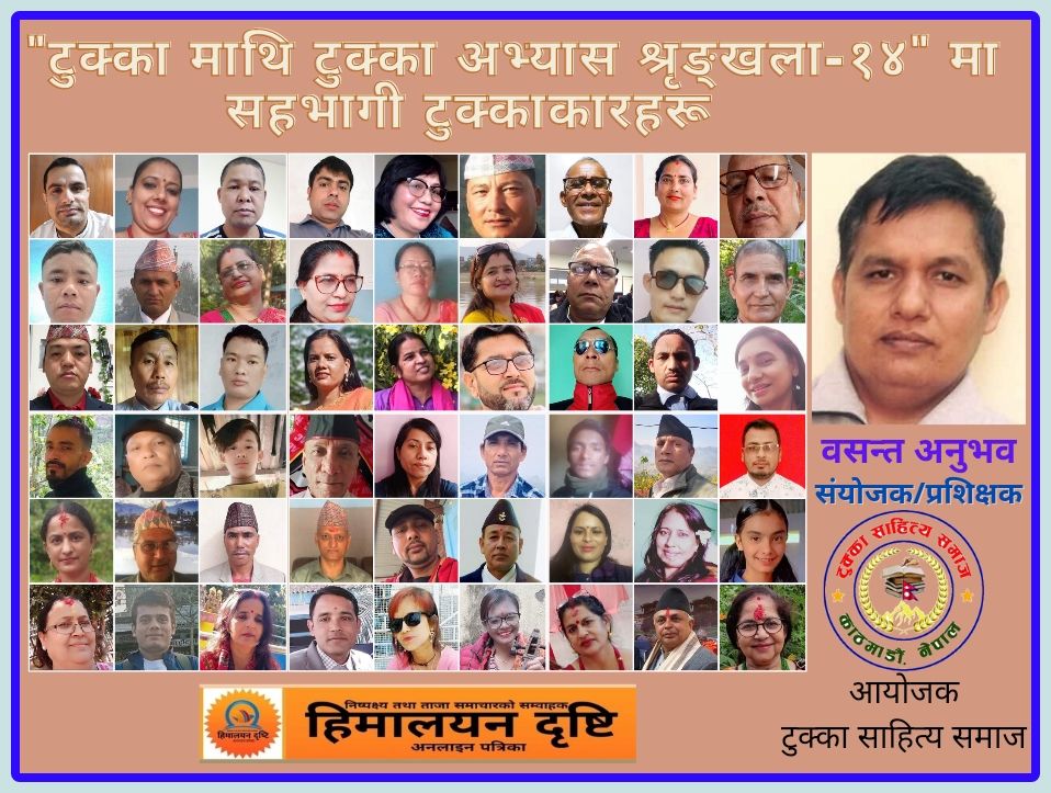 ‘टुक्का माथि टुक्का’ व्यङ्ग्यात्मक टुक्का लेखन अभ्यासको १४औं शृङ्खलाको लागि समाजका वरिष्ठ टुक्काकार वसन्त अनुभवले समसामयिक विषयमा लेख्नुभएको व्यङ्ग्यात्मक टुक्कालाई राखिएको संयोजक अनुभवले बताउनुभयो ।