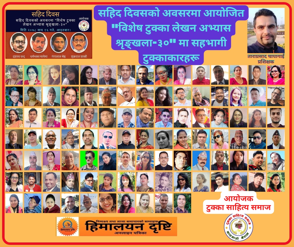 काठमाडाैँ, टुक्का साहित्य समाजकाे आयाेजनामा सहिद दिवसकाे अवसर पारेर २०७८ माघ १६ गते टुक्का मार्फत सहिदहरू प्रति श्रद्धा सुमन अर्पण गर्दै “विशेष टुक्का लेखन अभ्यास श्रृङ्खला-३०” सम्पन्न भएकाे छ ।