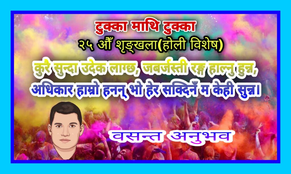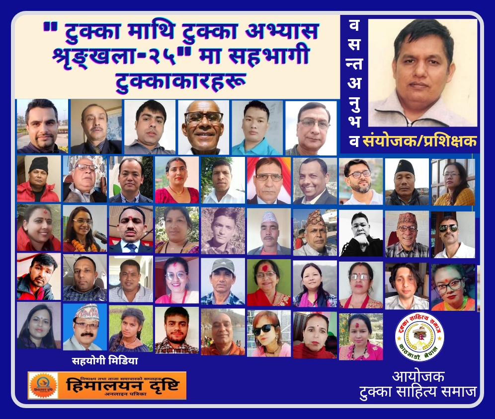 ‘टुक्का माथि टुक्का’ व्यङ्ग्यात्मक टुक्का लेखनको २५औँ शृङ्खलाको लागि समाजका वरिष्ठ टुक्काकार वसन्त अनुभवले समसामयिक विषयमा लेख्नुभएको व्यङ्ग्यात्मक टुक्कालाई राखिएको संयोजक अनुभवले बताउनुभयो ।