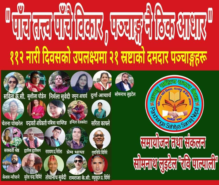 आज नारी दिवस परेको हुँदा , नारीको बारेमा पञ्चाङ्ग लेख्न हुन सबै सर्जकलाई अनुरोध गरिन्छ साथै अनुप्रास र स्थायी आफूखुसी राख्नु होला ।