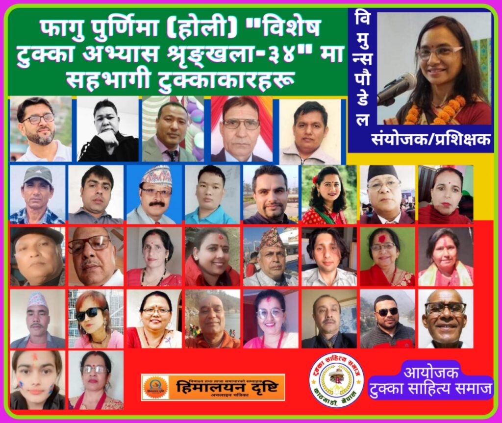 फागु पुर्णिमा अर्थात हाेली पर्व काे अवसर पारेर २०७८ चैत्र २ गते टुक्का साहित्य समाजकाे आयाेजनामा “विशेष टुक्का लेखन अभ्यास श्रृङ्खला-३४” सम्पन्न भएकाे छ ।
