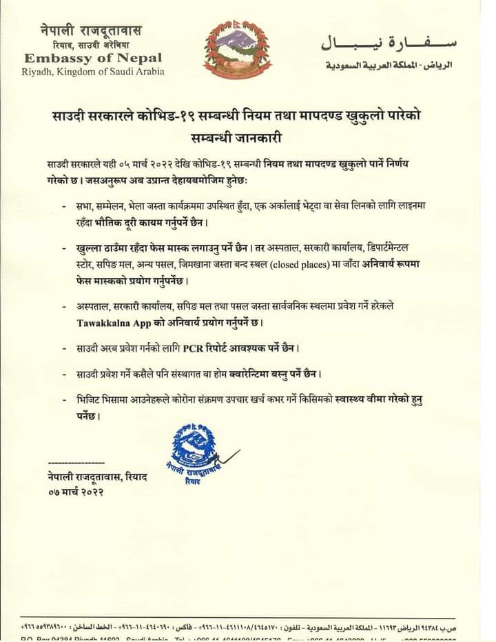 ७ मार्च २०२२, साउदी अरब ! नेपाली दूतावास रियादले आफ्नो फेसबुक पेजद्वारा साउदी सरकारले कोभिड- १९ सम्बन्धी नियम तथा मापदण्डहरुमा खुकुलो पारेको सम्बन्धी सबैमाझ जानकारी गराएको छ ।