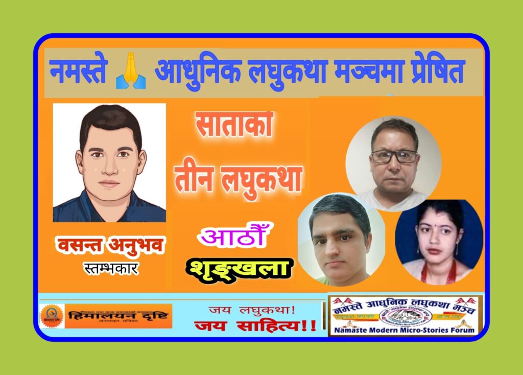 साताका तीन लघुकथाको आठौँ शृङ्खलामा नमस्ते आधुनिक लघुकथा मञ्चमा यो साता प्रेषित गरिएका लघुकथाहरू मध्ये निम्न तीन लघुकथाहरू (बा ! राम राम भन्नोस्, उनी र नाम) छनोट गरी प्रकाशन गरिएको छ।