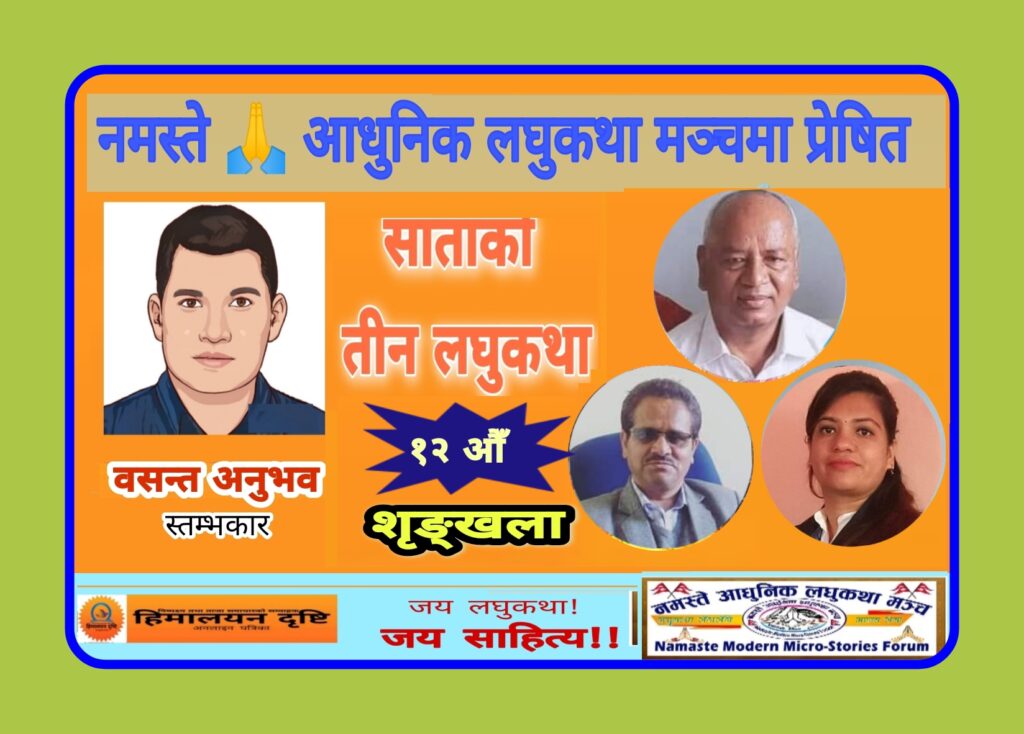 साताका तीन लघुकथाको बाह्रौँ शृङ्खलामा नमस्ते आधुनिक लघुकथा मञ्चमा यो साता प्रेषित गरिएका लघुकथाहरू मध्ये निम्न तीन लघुकथाहरू (चुनावी मेल, धुलौटे मानसिकता र भाषण) छनोट गरी प्रकाशन गरिएको छ।