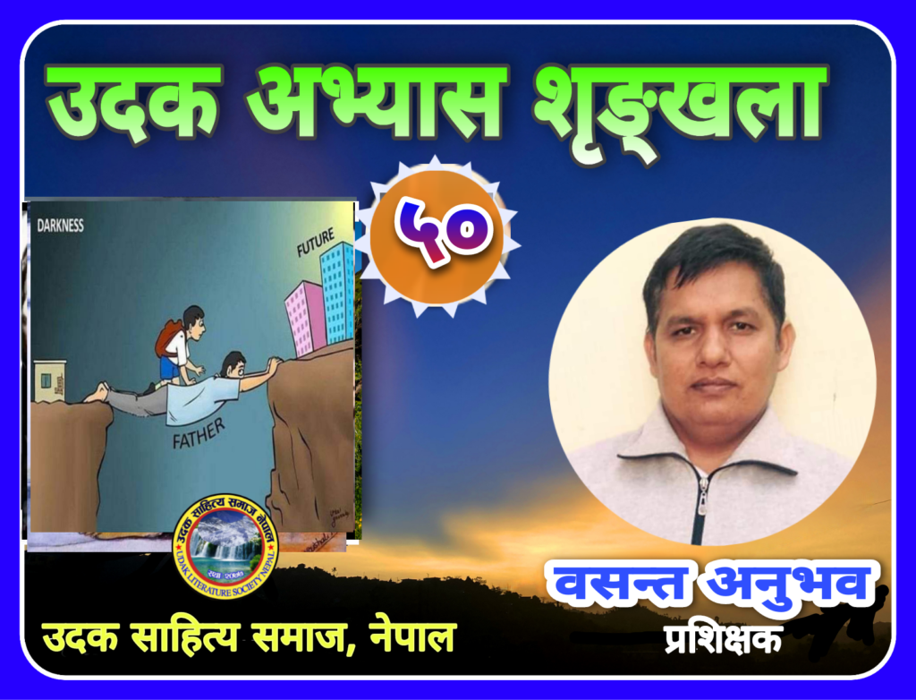 काठमाडौ, २४ बैशाख। साप्ताहिक तस्बिरमा उदक लेखन शृङ्खलाको ५०औँ भाग शनिबार सम्पन्न भएको छ । उदक साहित्य समाज, नेपालले उक्त कार्यक्रमको आयोजना गरेको थियो। उक्त शृङ्खलामा नेपाल लगायत विश्वका ४५ जना उदक स्रष्टाहरूको सहभागिता रहेको उदक लेखन शृङ्खलाका प्रशिक्षक एवं उदक साहित्य समाजका उपाध्यक्ष वसन्त अनुभवले बताउनुभयो ।
