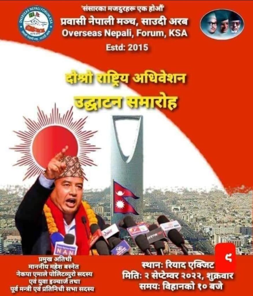 रियाद, नेकपा एमालेको प्रबास संगठन प्रवासी नेपाली मन्च साउदी अरबले आउदो २ सेप्टेम्बर २०२२ शुक्रबार रियादको एक्जिट ९ मा दोश्रो राष्ट्रिय अधिबेसन गर्ने भएको छ ।