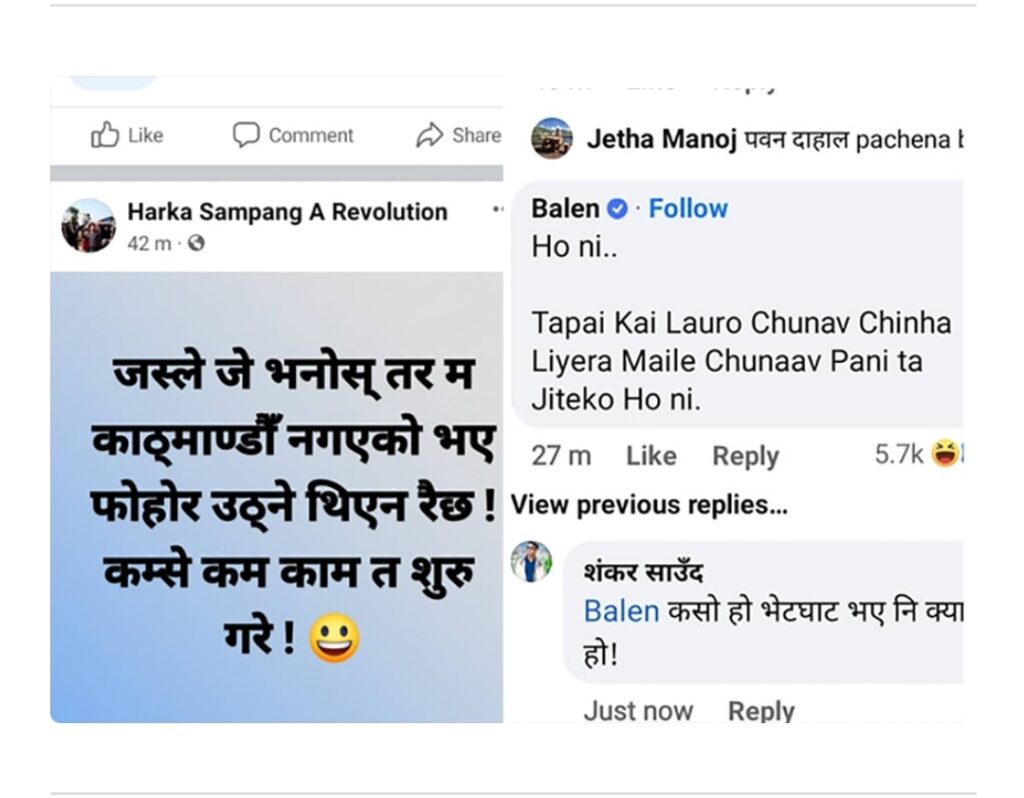 उनको पोष्टमा बालेनले प्रतिक्रिया दिएका छन् । उनले सम्पाङकै शैलीमा लेखेका छन्, ‘हो नि … तपाईकै लौरो चुनाव चिह्न लिएर मैले चुनाव पनि त जितेको हो नि !’