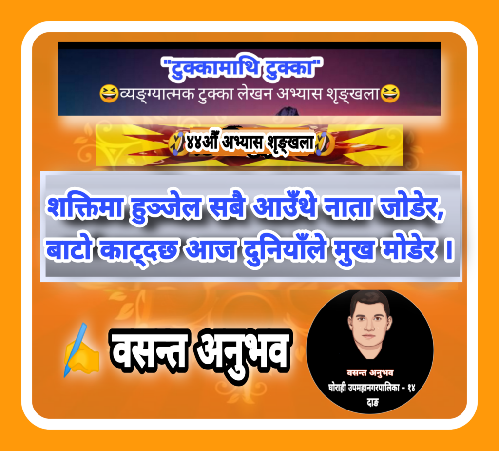 ‘टुक्का माथि टुक्का’ व्यङ्ग्यात्मक टुक्का लेखनको ४४ औँ शृङ्खलाको लागि समाजका वरिष्ठ टुक्काकार वसन्त अनुभवले समसामयिक विषयमा लेख्नुभएको व्यङ्ग्यात्मक टुक्कालाई राखिएको संयोजक अनुभवले बताउनुभयो ।