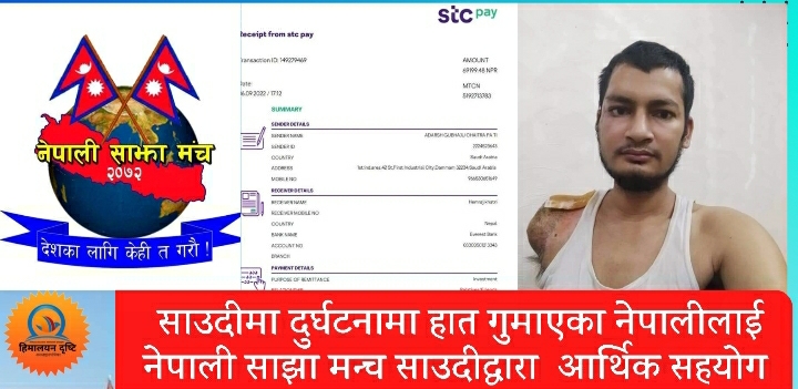 ८ सेप्टेम्बर २०२२, बिहीबार ! साउदी अरब वैदेशिक रोजगारीको सिलसिलामा केही बर्ष पहिले साउदी आएर काम गर्दै गर्दा गत जुलाईमा ड्युटी जाने क्रममा सवारी दुर्घटना परी एक हात गुमाएका दाङका हेम राज खत्रीलाइ “नेपाली साझा मंच” साउदीद्वारा आर्थिक सहयोग गरेको छ ।