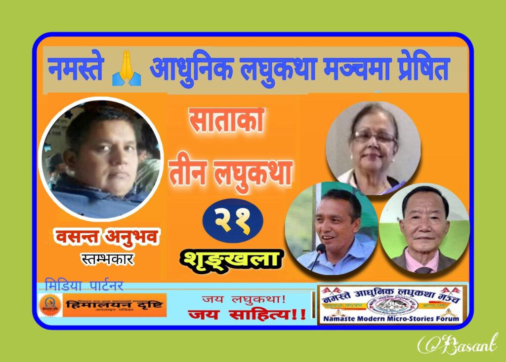 साताका तीन लघुकथाको एक्काइसौँ शृङ्खलामा नमस्ते आधुनिक लघुकथा मञ्चको भित्तोमा यो साता प्रेषित गरिएका लघुकथाहरू मध्ये निम्न तीन लघुकथाहरू (भैलोको मूल्य, सडकको समृद्धि र ऊ पनि मरेछ) छनोट गरी प्रकाशन गरिएको छ।