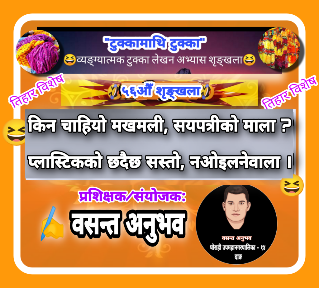 ‘टुक्का माथि टुक्का’ व्यङ्ग्यात्मक टुक्का लेखनको ५६ औँ शृङ्खलाको लागि समाजका उपाध्यक्ष वसन्त अनुभवले समसामयिक विषयमा लेख्नुभएको व्यङ्ग्यात्मक टुक्कालाई राखिएको संयोजक अनुभवले बताउनुभयो ।