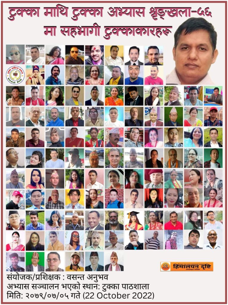 अभ्यासमा नेपाल लगायत विश्वका १ सय ११ जना नेपाली भाषी टुक्काकारहरूको सहभागिता रहेको कार्यक्रम संयोजक/ प्रशिक्षक एवम् टुक्का साहित्य समाजका उपाध्यक्ष वसन्त अनुभवले बताउनुभयो । टुक्का साहित्य समाजको आयोजनामा उक्त शृङ्खला विगत लामो समय देखि नियमित रूपमा सञ्चालन हुँदै आएको छ।