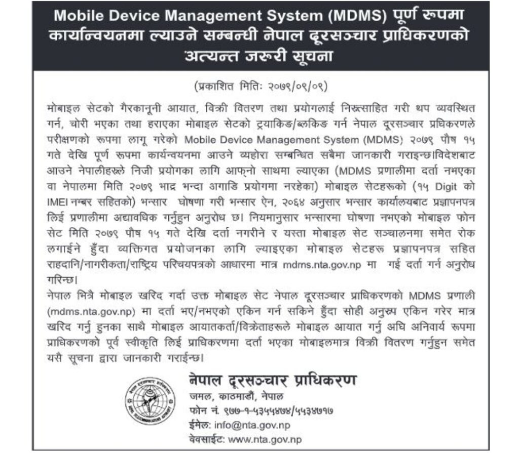 काठमाण्डौ,९ पुस । नेपाल दूरसञ्चार प्राधिकरणले आउँदो पुस १५ देखि मोबाइल डिभाइस म्यानेजमेन्ट सिस्टम (एमडीएमएस) पूर्ण रुपमा कार्यान्वयनमा ल्याउने जनाएको छ । आज सूचना निकालेर प्राधिकरणले पुस १५ गतेभित्र मोबाइलहरु दर्ता गर्न आह्वान समेत गरेको छ ।
